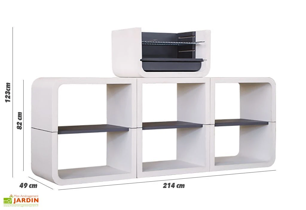 Ce barbecue en béton mesure 214 cm de large sur 49 cm de profondeur. Il propose divers espaces de rangement avec étagères, parfaits pour stocker votre charbon de bois ou pour accueillir des ustensiles de cuisson et autres accessoires. Tous les modules sont livrés en kit et devront donc être assemblés par vos soins. Une grille de cuisson en inox de 58 x 28 cm est également incluse et un bac récupérateur vous permettra de collecter et de vider les cendres en toute simplicité après chaque utilisation.