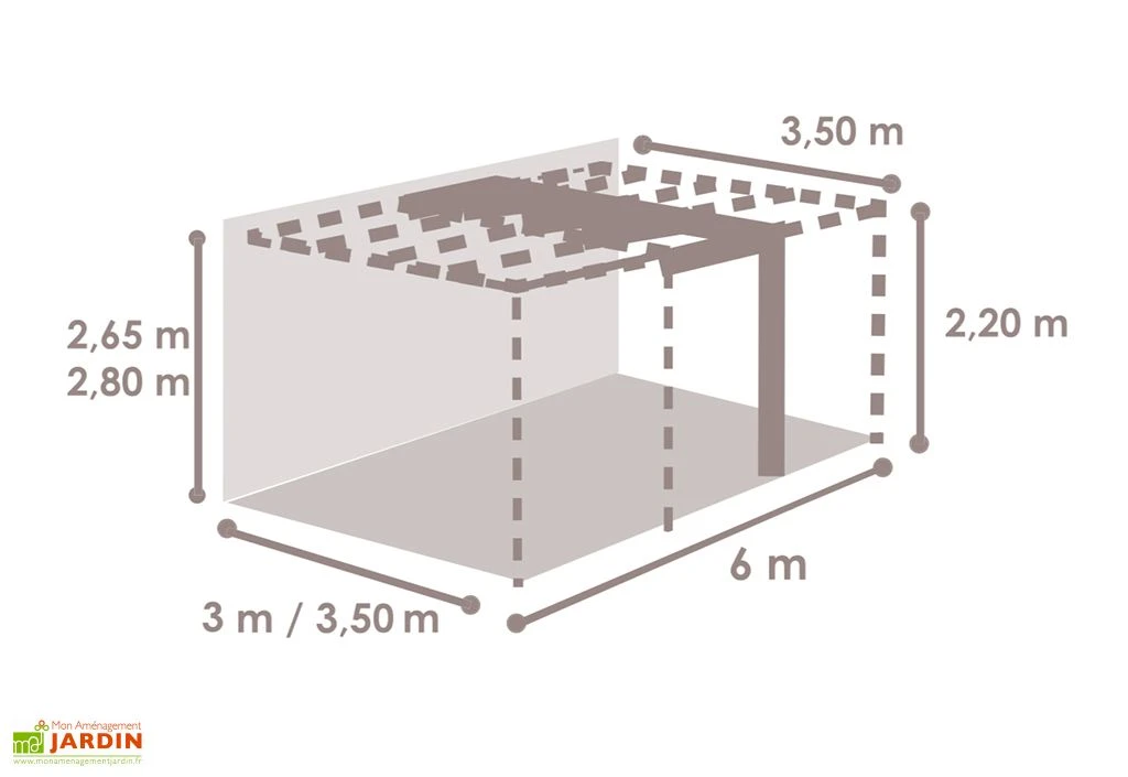 L’extension mesure 3,50 m de profondeur, 2,00 m de largeur et 2,65 à 2,80 m de hauteur. Ses pieds sont réglables en profondeur entre 3,00 et 3,50 m pour s’adapter à vos besoins. Elle est recouverte d’un store enroulable en acrylique de 250 gr/m² d’épaisseur. Le store bénéficie de son coffre en aluminium pour le protéger. L’enrouleur à ressort, les attaches corde, les poulies et les rails sont inclus.