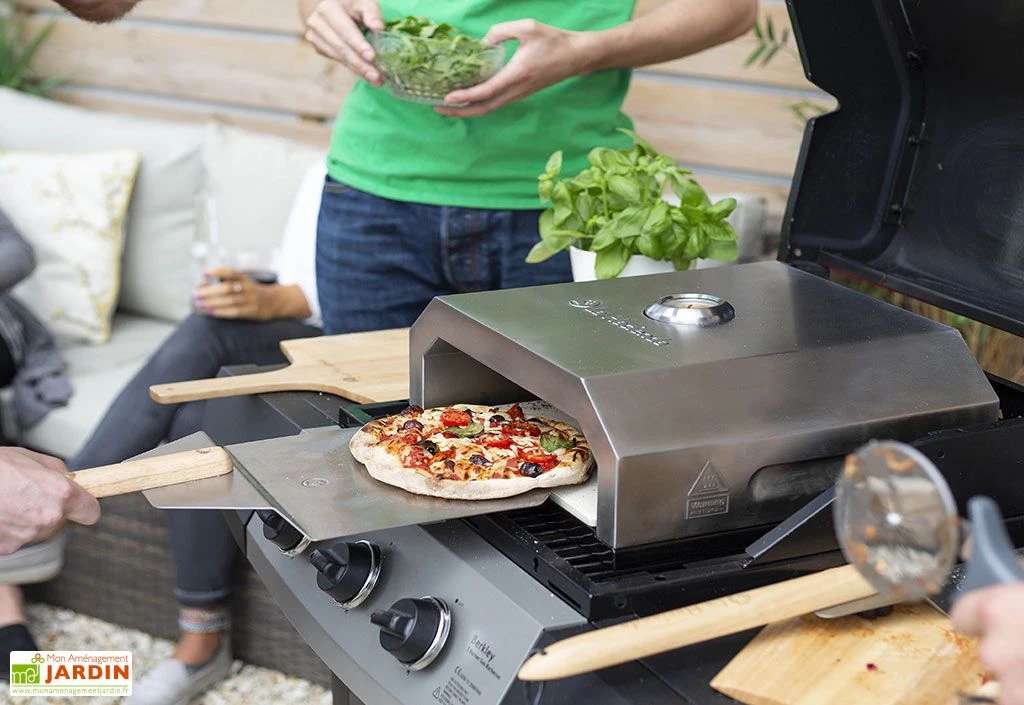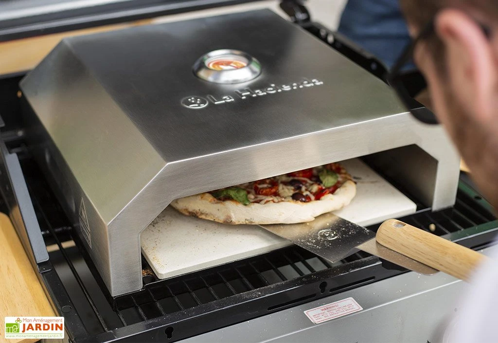 Le four à pizza La Hacienda s’installe sur votre barbecue au gaz ou sur votre barbecue au charbon de bois. Il mesure 35 cm de profondeur, 40 cm de largeur et 15 cm de hauteur. Le four est en acier inoxydable et il comprend une pierre à pizza amovible de 12 mm d’épaisseur.