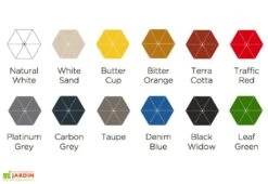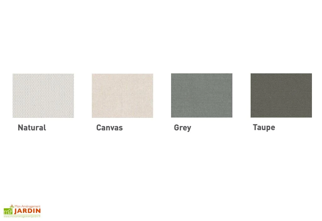 La toile du parasol est en acrylique, d’une épaisseur de 250 gr/m². Elle est disponible en plusieurs coloris et permet de ne pas emmagasiner la chaleur. Facile à entretenir, elle se lave à la machine à laver et peut se sécher au sèche linge. Elle est protégée contre les UV classe 8, contre les salissures grâce à un traitement anti-taches et contre les variations de température entre -20° et +70°C. La hauteur sous toile est de 2,25 m.