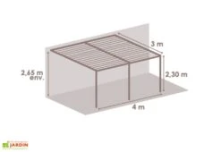 Cette pergola en aluminium mesure 3 m de profondeur, 4 m de largeur, 2,3 m de hauteur à l’avant et 2,7 m de hauteur à l’arrière. Elle offre 12 m² protégés contre la chaleur et une pluie fine.