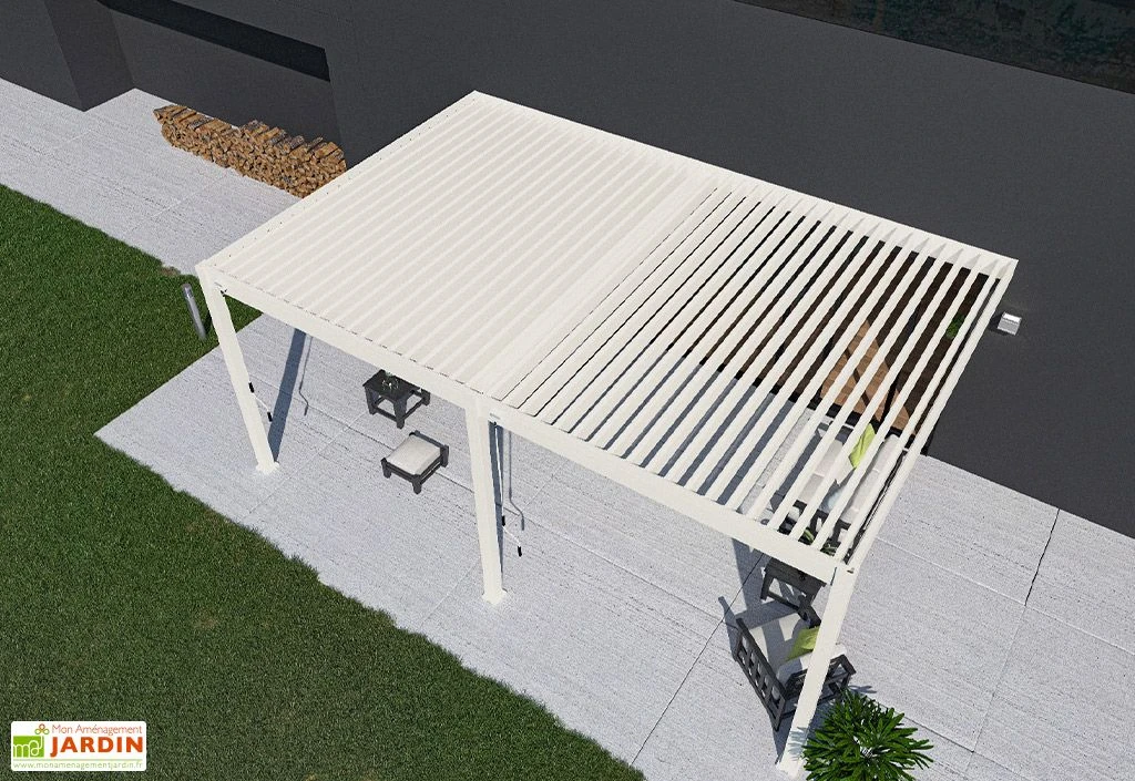 La toiture de cette pergola bioclimatique est équipée de 38 lames en aluminium blanc de 377 x 17 x 3 cm. Ces doubles lames sont orientables manuellement jusqu’à 135° à l’aide de 2 manivelles pouvant contrôler indépendamment les deux côtés de la pergola. Lorsqu’elles sont ouvertes les lames sont parfaitement invisibles de l’extérieur grâce à des extensions placées sur les poutres et lorsqu’elles sont fermées elles protègent du soleil comme de la pluie. En effet, ces lames sont étanches et un système va permettre d’évacuer l’eau à l’intérieur des poteaux.