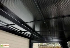 Cette pergola fermée est constituée d’une structure en aluminium, avec des poteaux de 12 x 12 cm de section qui viennent stabiliser le tout et une visserie en acier inoxydable. Sa toiture est quant à elle fabriquée en tôles d’acier galvanisé. La combinaison de ces matériaux permet au pavillon de ne demander aucun entretien tout en résistant parfaitement à la corrosion.