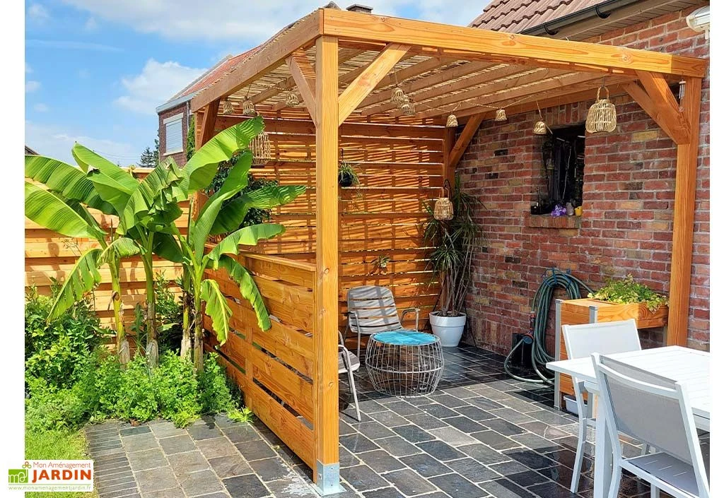 Vous pourrez choisir cette pergola nue ou livrée avec 1, 2 ou 3 modules. Chaque module est en fait un demi-panneau que vous pouvez décider d’assembler ou non sur une même façade. Vous pouvez ainsi profiter d’un panneau plein en combinant 2 modules pour vous protéger du soleil ou d’un vis-à-vis ou créer un pool house en installant 3 demi-panneaux tout autour de la tonnelle. C’est vous qui décidez !