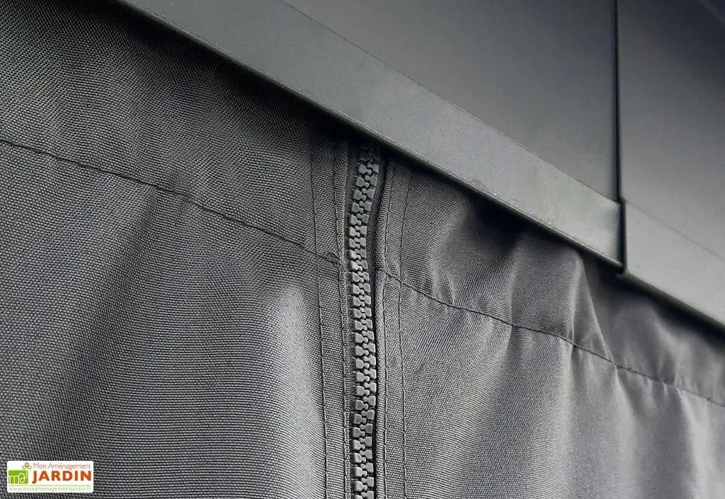 Les rideaux s’installent sur la pergola Dallas de chez Palram-Canopia. Ils sont en polyester gris foncé et sont livrés par lot de 4. Totalement indépendants les uns des autres, ils vous permettent de fermer la pergola sur les 4 côtés. Pratiques, vous pouvez faire le choix de les fixer ensemble grâce à des fermetures éclairs, ou de les laisser ouverts en les attachant aux poteaux.